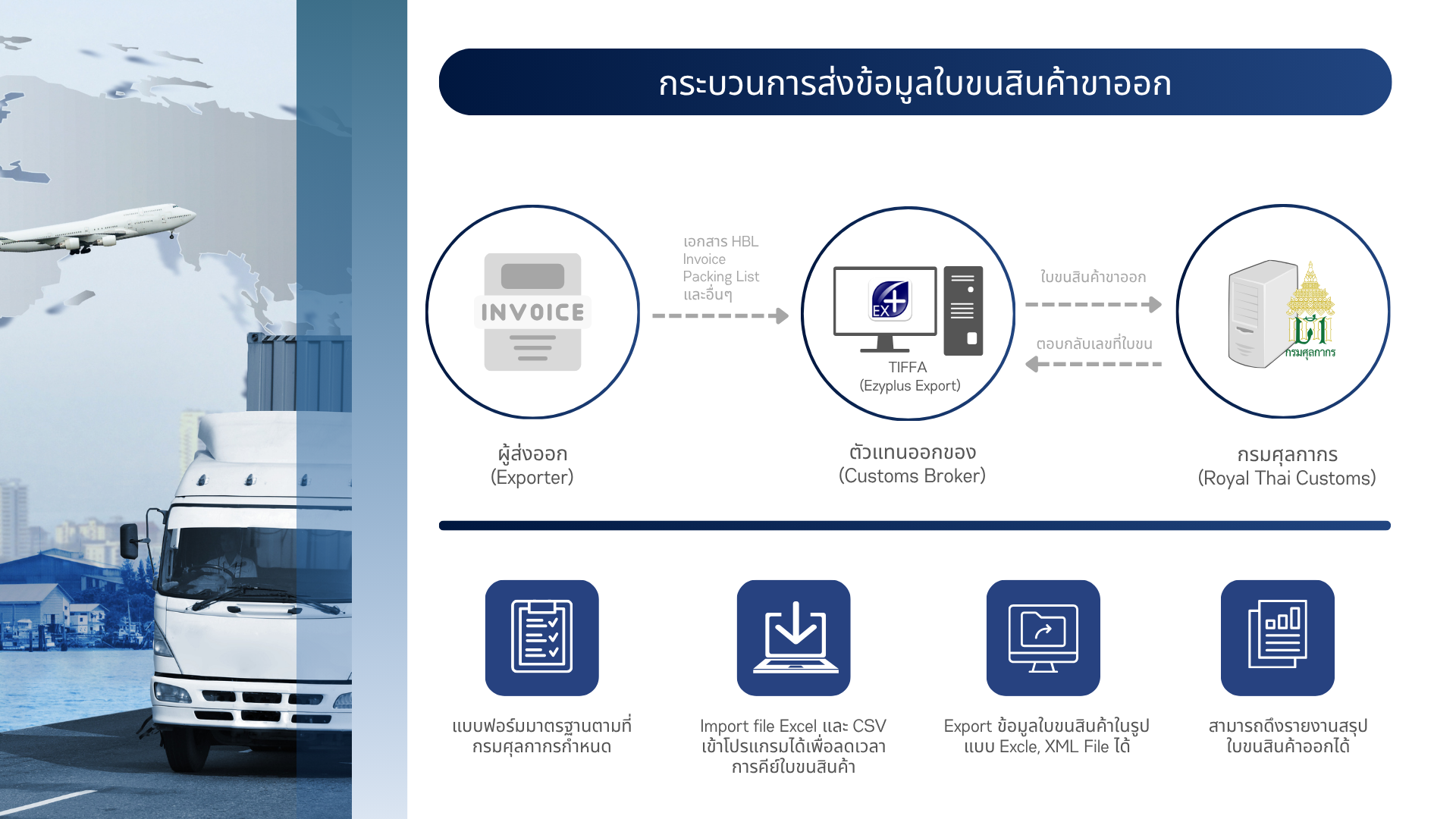 เป็น Software ที่ใช้ในการจัดการใบขนสินค้าขาออกเพื่อขออนุญาตส่งสินค้าออกทั้งทางรถ/เรือ/อากาศ โดย Software นี้เชื่อมต่อกับ Server ของทิฟฟ่าเพื่อส่งต่อไปยังระบบของกรมศุลกากรต่อไป ขบวนการนี้รวมไปถึงการจัดทำลายเซ็นต์อิเล็กทรอนิคส์เพื่อไม่ต้องพิมพ์เป็นเอกสารด้วย